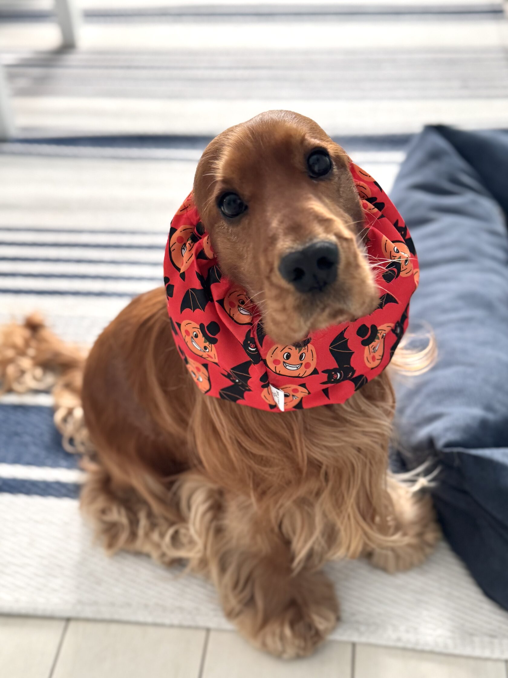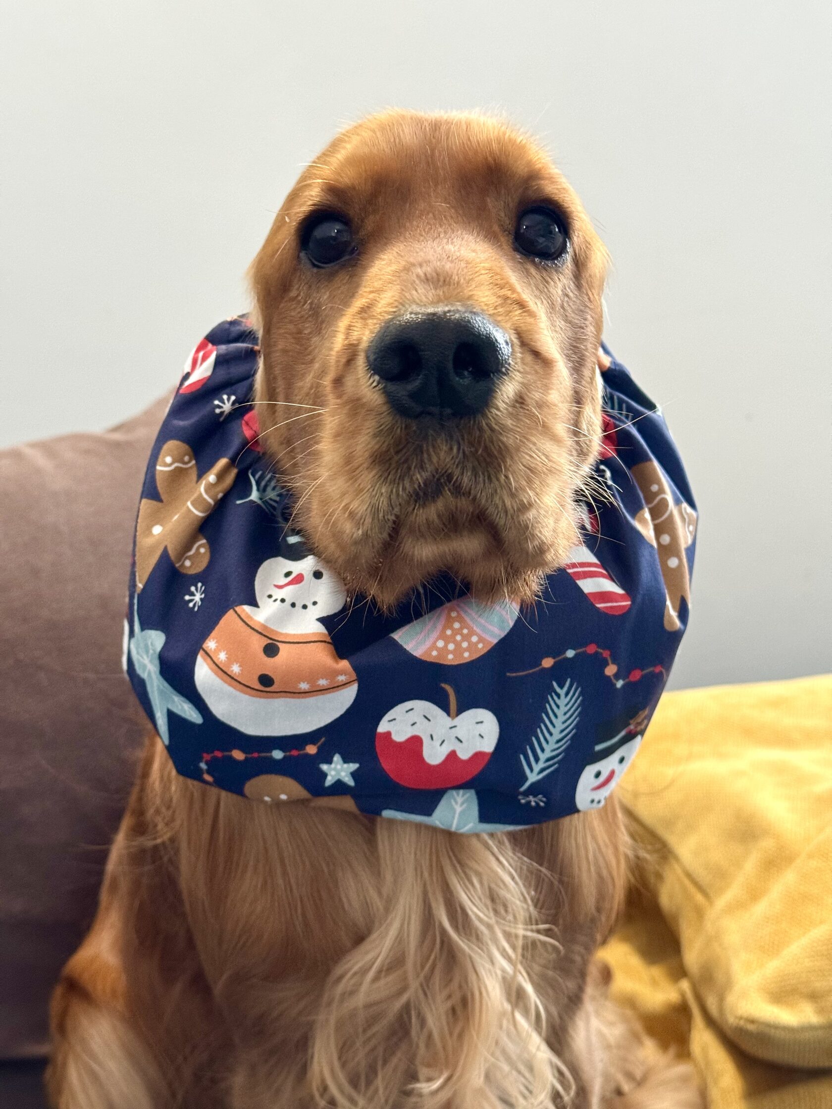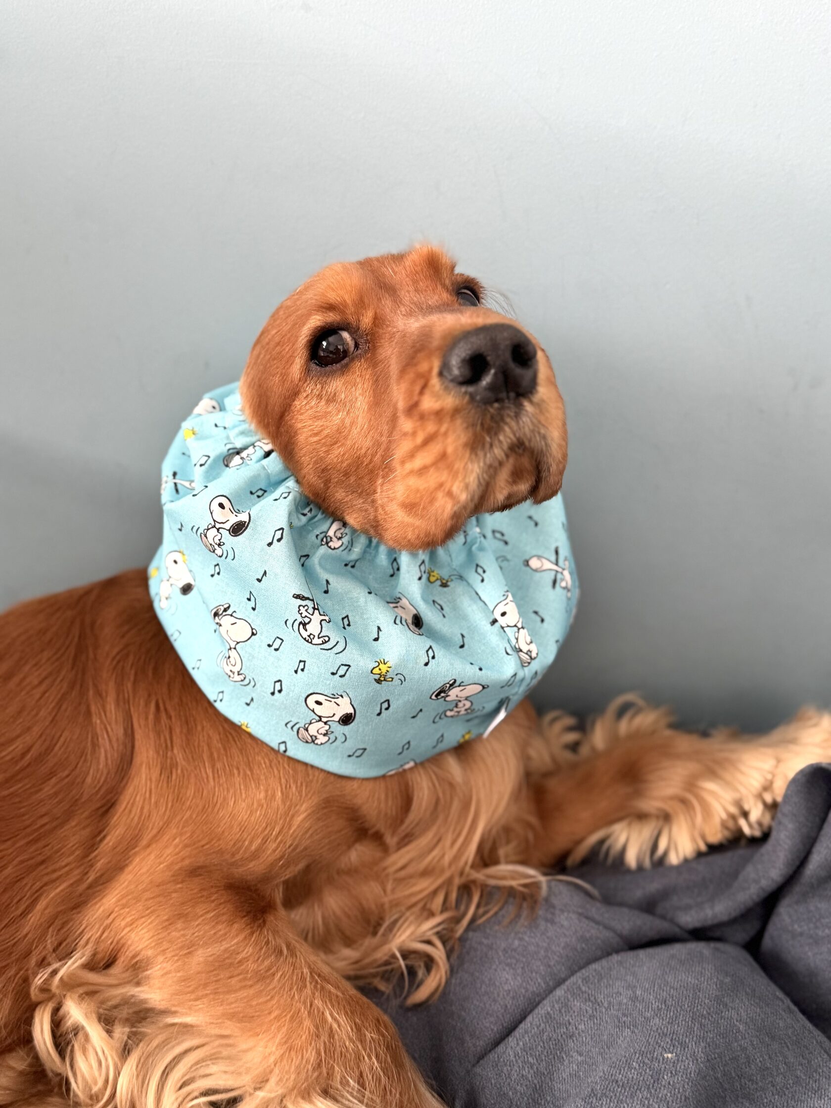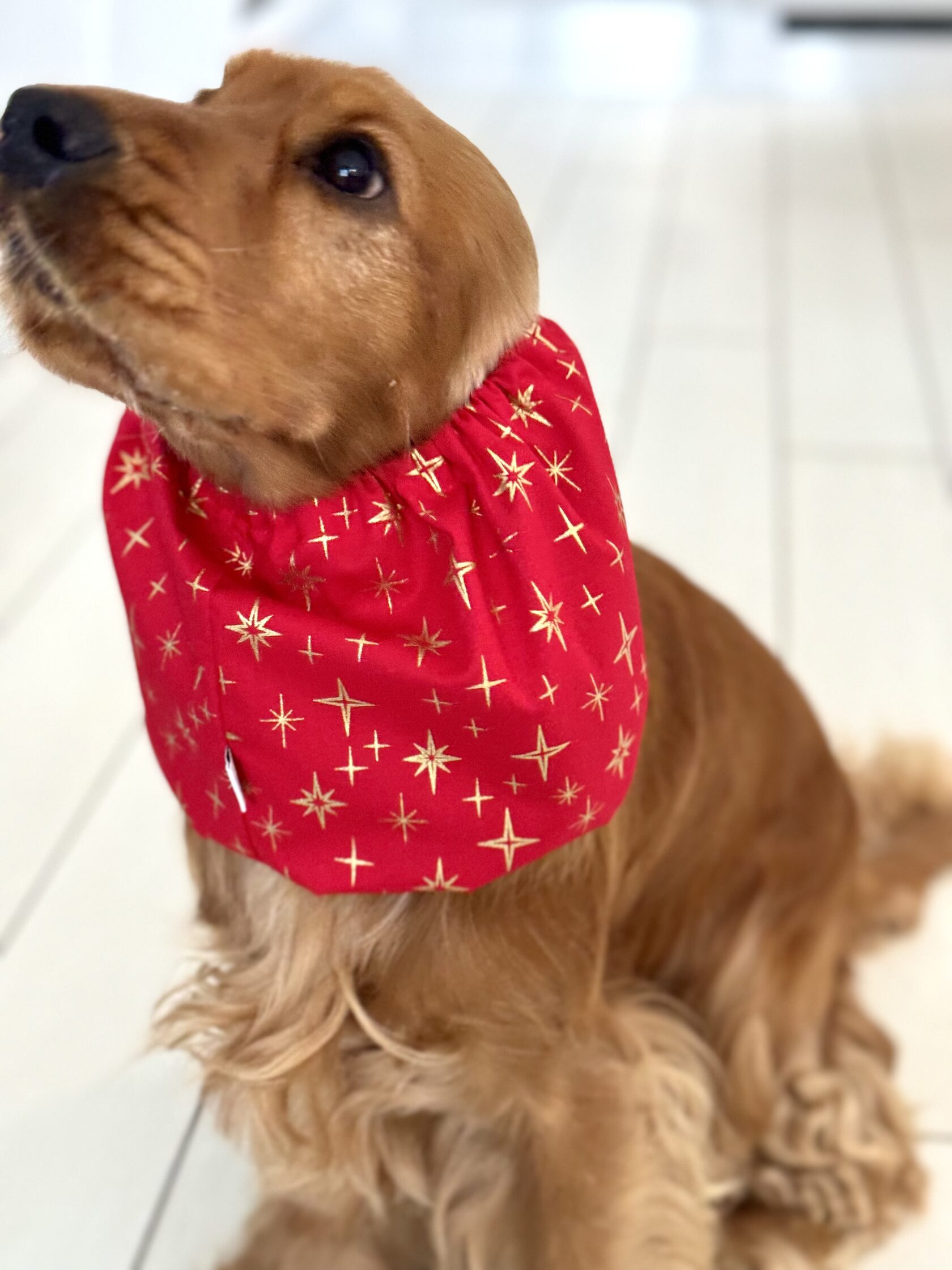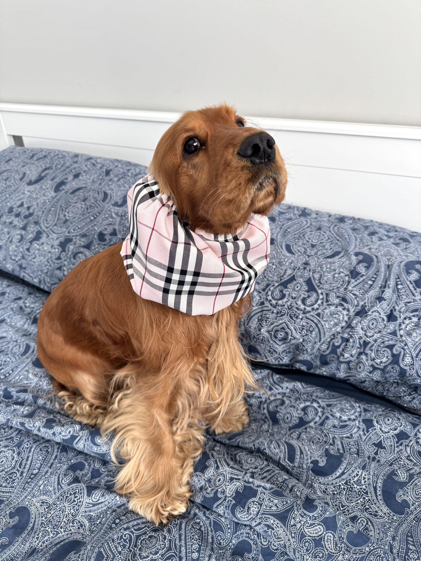 We offer snoods in a variety of colors, patterns, and materials, allowing you to find the perfect one to match your dog's personality!